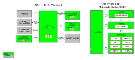 本方案基于i.MX RT1170設(shè)計(jì),高性能的Cortex-M7核作為主核專注于圖像顯示處理,高能效的Cortex-M4作為從核通過CAN總線接收速度、里程、電量等車輛信息,再通過MU(Messaging Unit)數(shù)據(jù)傳遞單元傳輸至主核并顯示于儀表界面。除此之外,方案采用了開源輕量級(jí)顯示圖形庫(kù)LVGL,液晶屏分辨率為720x1280,并借助通用圖形加速引擎、矢量圖形處理、多圖層優(yōu)化等策略,改進(jìn)顯示效果提高幀率。