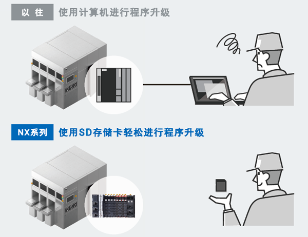 在NX系列產(chǎn)品上,無需經(jīng)由計(jì)算機(jī)操作工具,僅使用SD儲(chǔ)存卡即可完成程序升級(jí)。此外,還能夠避免程序因誤操作而遭改寫,可輕松、有效地進(jìn)行維護(hù)。