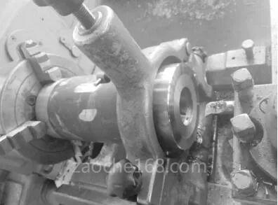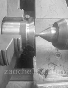 底座加工路線:下料(全長(zhǎng)按圖加長(zhǎng)15mm)→車(chē)(上端面留假頂尖孔,下端面留中心孔)→淬火、回火(58~62HRC)→清洗→車(chē)(選用YT726焊接刀具或立方氮化硼夾固刀具,裝夾采用端面平胎和用回轉(zhuǎn)頂尖頂持假頂尖孔雙頂?shù)姆绞?,?chē)削30°錐面,如圖1-115所示。在配研車(chē)削過(guò)程中,將三瓣模放在平臺(tái)上,用三瓣模的30°錐面和底座的30°錐面逐步配研車(chē)削,如圖1-116所示,車(chē)削底盤(pán)30°錐面時(shí),在微量間隙配研車(chē)削調(diào)整過(guò)程中,用塞尺檢測(cè)三瓣模的貼合間隙,當(dāng)三瓣模處于緊密貼合狀態(tài)時(shí),底盤(pán)的30°錐面和三瓣模的30°錐面也處于緊密配合狀態(tài)。采用帶有30°錐面的專用夾爪裝夾底座,如圖1-117所示,車(chē)削臺(tái)階外徑及端面并去除假頂尖孔,臺(tái)階端面留磨量0.1~0.15mm)→平磨(臺(tái)階端面見(jiàn)平,控制長(zhǎng)度尺寸)→車(chē)(將模套、三瓣模、底盤(pán)合裝后,將合裝后的底面加工平整,如圖1-118所示)。