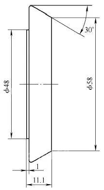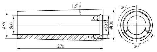 三瓣模具(見(jiàn)圖1)是由模套(見(jiàn)圖2)、三瓣模(見(jiàn)圖3)及底盤(pán)(見(jiàn)圖4)組合而成,其中底盤(pán)和三瓣模的30°錐面配合,120°等分的三瓣模外錐面與模套的內(nèi)錐面緊密配合,底盤(pán)的30°錐面與三瓣模的30°錐面配研后按觸面積均大于70%。