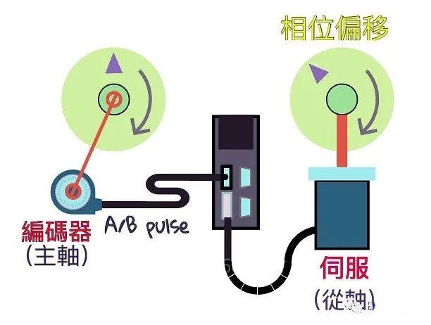 講了這么多,終于可以進(jìn)入正題了!如果把上述的機(jī)械傳動(dòng)改成伺服的電子凸輪,效果會(huì)是如何呢?如圖3所示,我們將皮帶拆除,用編碼器采集主軸的位置,以A/B相脈波的方式傳給伺服,伺服以直線的電子凸輪來(lái)驅(qū)動(dòng)從軸做跟隨: