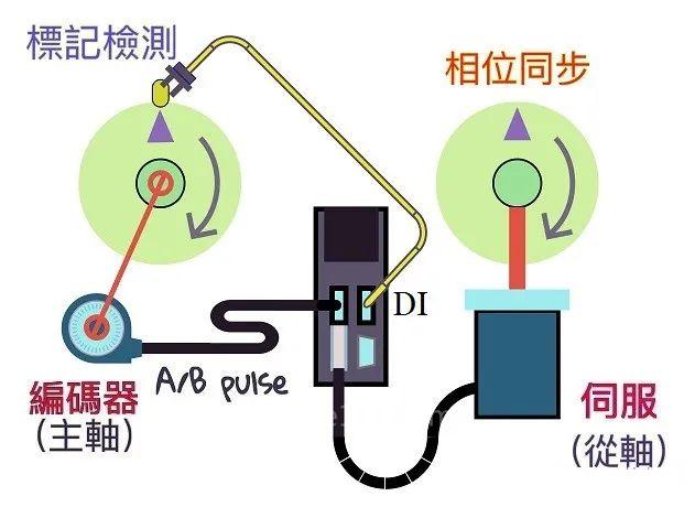 在主軸上安裝一個(gè)標(biāo)記當(dāng)作"齒",并用感測(cè)器將信號(hào)讀進(jìn)伺服的DI,再根據(jù)編碼器的型號(hào)得知主軸轉(zhuǎn)一圈應(yīng)該會(huì)有R個(gè)脈波。由于一圈只有一個(gè)齒,所以齒的寬度就是R(單位是主軸的脈波)。如此,只要伺服每感測(cè)到一個(gè)"齒",就知道應(yīng)該要收到R個(gè)脈波,如果數(shù)量不對(duì),就可加以補(bǔ)償,讓脈波總數(shù)一直跟齒數(shù)維持正確的關(guān)系,如此便可讓主/從軸的相位永不偏移,保持同步!這功能在臺(tái)達(dá)ASD-A2 與 ASD-M-R伺服里都已具備,在凸輪的主軸來(lái)源 P5-88.Y里,選擇實(shí)體脈波相當(dāng)于使用平皮帶;選用同步軸就相當(dāng)于使用正時(shí)皮帶,非常方便!設(shè)定方式請(qǐng)參考 A2凸輪同步軸的設(shè)定方法!