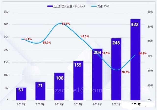 在IFR最新發(fā)布的中國(guó)機(jī)器人密度數(shù)據(jù)中,中國(guó)制造業(yè)機(jī)器人密度再創(chuàng)新高,增長(zhǎng)至322臺(tái)/萬人。2015-2021年,中國(guó)制造業(yè)機(jī)器人密度增長(zhǎng)5.3倍。