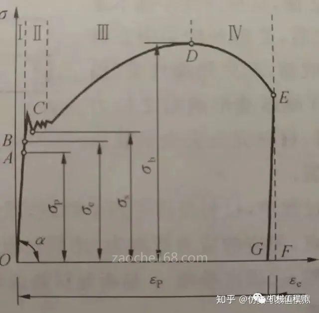 通過對上述關于強度和剛度的理論理解,相對于剛度,強度的定義針對的是外力作用下的破壞,而破壞類型的分類為塑形屈服及脆性斷裂,由此聯(lián)想到拉伸時的應力應變曲線。如圖所示。
