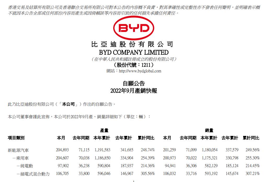 10月3日,比亞迪公布2022年9月產(chǎn)銷數(shù)據(jù)。數(shù)據(jù)顯示,2022年9月比亞迪新能源汽車銷量201259輛,同比增長(zhǎng)183.1%;新能源乘用車銷量為200973輛,同比增長(zhǎng)187.0%。其中,插電混動(dòng)車銷量為106032輛,純電動(dòng)車銷量94941輛。