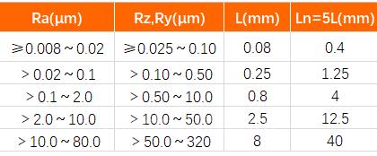Ra、Rz、Ry的取樣長(zhǎng)度L與評(píng)定長(zhǎng)度Ln選用值