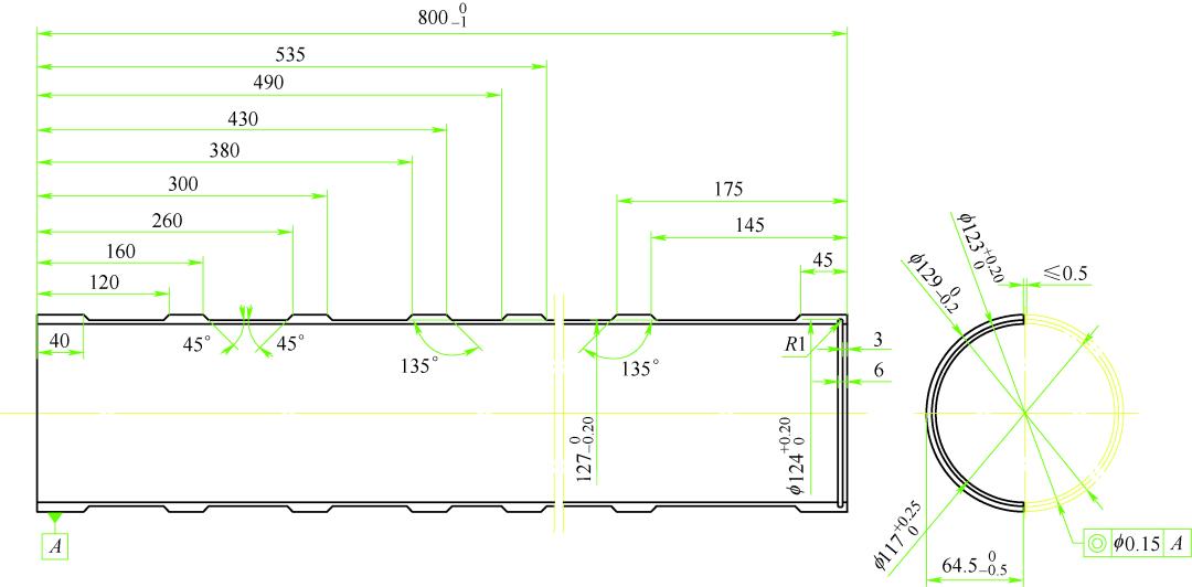 圖1所示兩瓣瓦材料為2A12-T4鋁合金,結(jié)構(gòu)為對(duì)稱結(jié)構(gòu),尺寸精度及幾何公差要求都非常嚴(yán),全長(zhǎng)mm,外徑
