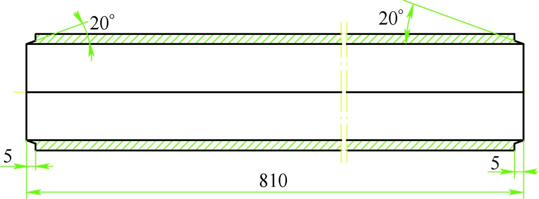 (4)車定位錐面 設(shè)計(jì)定位錐面作為工藝臺(tái)階。采用車定位錐面專用夾套裝夾兩瓣瓦,該夾套采用35CrMnSiA材料,淬火硬度40~45HRC,保證了夾套的強(qiáng)度。夾套上每90°均布4個(gè)M14螺紋孔,螺釘端面需平整光滑,保證定位夾緊準(zhǔn)確[1]。使用時(shí)將兩個(gè)夾套分別固定在對(duì)稱剖開(kāi)鋁筒毛坯的上下兩端,其中兩個(gè)對(duì)稱螺釘對(duì)正兩瓣瓦縫隙處,先輕輕預(yù)緊這兩個(gè)螺釘,使對(duì)稱剖開(kāi)處平整,防止兩瓣瓦錯(cuò)位。然后壓緊兩瓣瓦圓弧頂點(diǎn)處的兩個(gè)螺釘,使兩瓣瓦對(duì)稱壓合,保證工件銑削平面均勻接觸無(wú)縫隙,將固定好的兩瓣瓦采用雙頂?shù)姆绞窖b夾在車床上,車外圓基準(zhǔn)面(見(jiàn)圖3)。以外圓基準(zhǔn)面為定位基準(zhǔn),車削兩端面及內(nèi)徑定位止口(見(jiàn)圖4),控制全長(zhǎng)810mm。采用兩頂方式裝夾工件,車削兩端錐角為20°的5m深的定位錐面(見(jiàn)圖5)。在車削過(guò)程中需采用與之配合的定位套檢驗(yàn)錐度,并控制定位套與端面間隙在0.15mm之內(nèi),保證在壓緊的情況下定位牢固準(zhǔn)確,控制工件全長(zhǎng)800mm。車削定位錐面及全長(zhǎng)尺寸如圖6所示。