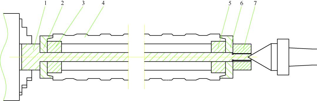 1—中心軸 2—左定位壓蓋 3—左定位套 4—工件 5—右定位套 6—右定位壓蓋 7—壓緊螺母