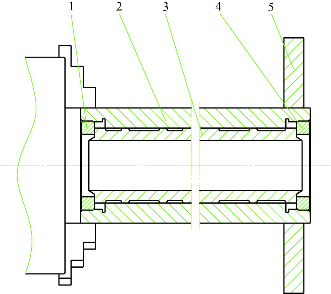 1—左端壓蓋 2—夾具本體 3—工件 4—右端壓蓋 5—中心架