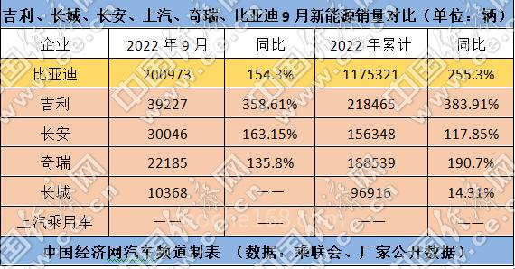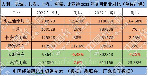 從銷量排名來看,蟬聯(lián)冠軍的比亞迪乘用車再次刷新銷量記錄,其9月單月銷量突破20萬輛,前三季度的累計銷量也率先突破百萬輛。吉利、長安乘用車和奇瑞的單月銷量均超10萬輛,分列第二、三、四位。