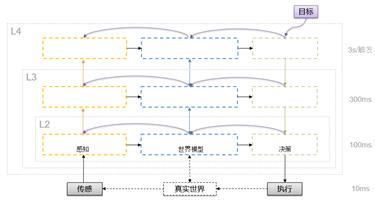 自動駕駛算法和大腦一樣,有一個對處理時間的要求。一般的周期在10ms-100ms之間,可以滿足對環(huán)境變化的反應(yīng)要求。但環(huán)境有時簡單有時卻非常復(fù)雜。很多算法模塊無法達(dá)成這個時間要求。比如思考一遍人生的意義可能不是100ms可以搞定的事情,如果每走一步路都要思考一遍人生,對大腦一定是一種摧殘。計算機(jī)也是如此,存在算力和運(yùn)算速度的物理限制。解決方法就是引入分層框架。