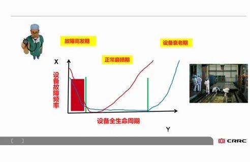 這張圖中的X軸坐標是機床故障的頻率, Y軸是全生命周期的應(yīng)用時間,曲線分為三個階段,第一個是設(shè)備故障高發(fā)期,第二個是正常磨損期,第三個是老化期,在設(shè)備故障高發(fā)期,也就是新機床,故障率較高是正常的,但這個周期不能太長,綠色曲線是正常的趨勢,這個曲線就是機床的普遍特性和規(guī)律。紅色曲線沒有正常磨損期,則代表了機床可能存在設(shè)計問題、裝配問題以及應(yīng)用問題。
