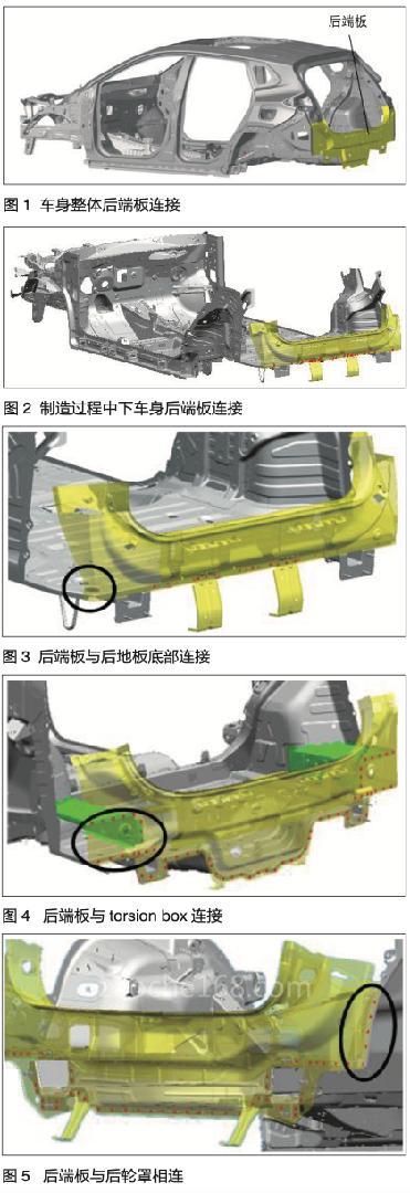 后端板總成是車身重要的連接零件,其通過(guò)點(diǎn) 焊與車身后地板和左右側(cè)圍后部相連,如圖 1 所示。在車身整體的連接中,其連接強(qiáng)度非常好,可以滿 足制造過(guò)程中機(jī)運(yùn)運(yùn)輸?shù)膯?dòng)、急停等制造工況要求。然而,根據(jù)車身結(jié)構(gòu)設(shè)計(jì)及制造裝配順序,在下車身與上車身裝配之前,后端板僅與后地板連接, 如圖 2 所示。因此,為了保證后端板在工位之間機(jī)運(yùn)運(yùn)輸制造過(guò)程中的連接和尺寸的穩(wěn)定性,后端板與下車身連接需保證足夠的強(qiáng)度,從而保證與后道 工位的零件良好的尺寸匹配,避免后端板在與下車身的制造過(guò)程中發(fā)生永久變形。