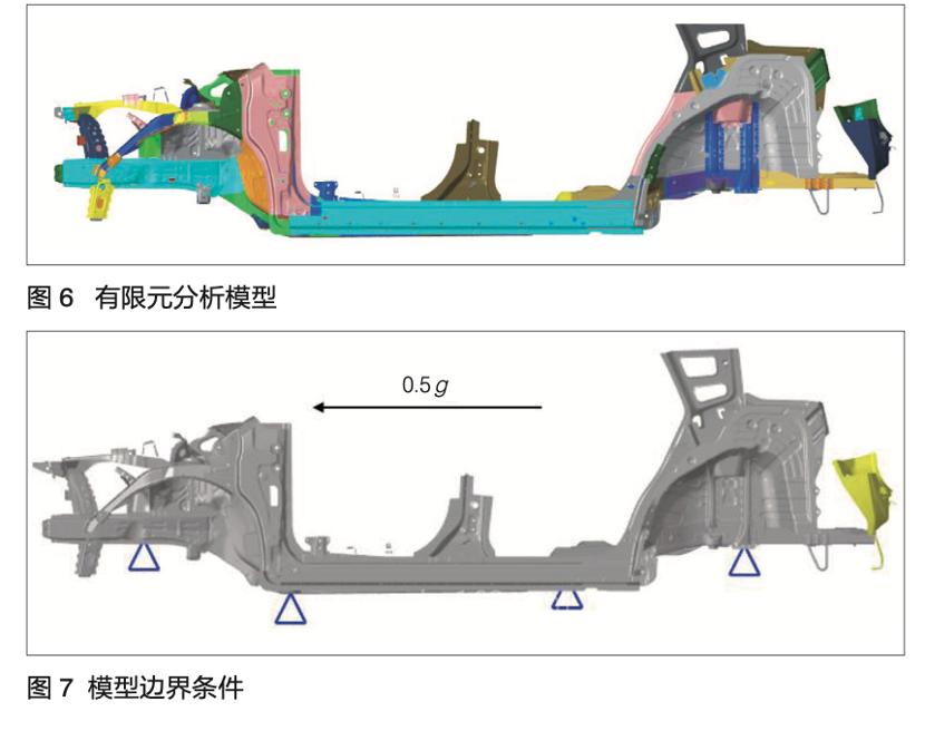 車身制造過(guò)程中,零件總成之間需滿足一定的連接強(qiáng)度,從而保證車身制造過(guò)程中良好的連 接質(zhì)量和尺寸匹配要求。由于分析工況主要是評(píng)估后端板在下 車身總成中是否存在運(yùn)輸變形風(fēng)險(xiǎn),采用下車身有限元模型對(duì)后端板運(yùn)輸狀態(tài)進(jìn)行仿真分析。
