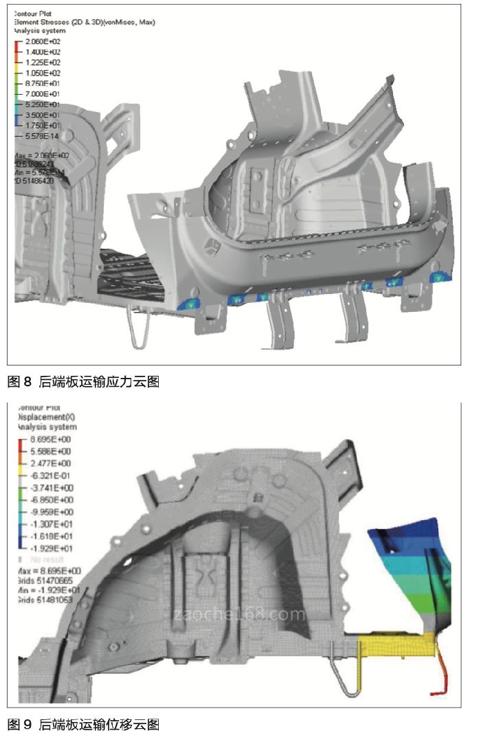 一般來(lái)說(shuō),圖4和圖5由于增加了后端板上部連接,整體連接分布較均衡,在制造過(guò)程中,后端板與下車身連接強(qiáng)度較好。圖3的連接形式由于結(jié)構(gòu)設(shè)計(jì)原因,連接分布在底部,為確保其連接強(qiáng)度滿足車身制造過(guò)程中機(jī)運(yùn)運(yùn)輸變形的要求,在車身工藝前期同步工程中,采用有限元仿真方法對(duì)其制造過(guò)程中的連接強(qiáng)度進(jìn)行分析,并根據(jù)分析結(jié)果指導(dǎo)結(jié)構(gòu)改進(jìn)和優(yōu)化,使其滿足制造要求,避免制造過(guò)程中零件發(fā)生永久變形,防止零件后期更改造成零件修模等成本的增加。