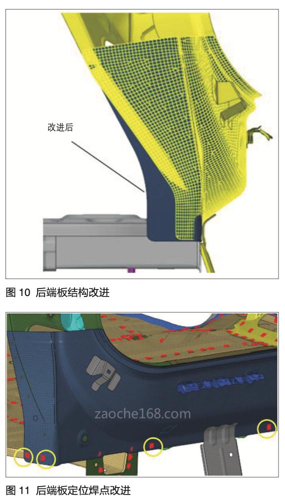 根據(jù)上述分析結(jié)果,后端板與下車身連接強(qiáng)度不足,造成后端板運(yùn)輸過(guò)程中零部件連接處發(fā)生永久變形。因此,需 通過(guò)增加結(jié)構(gòu)連接,使其滿足制造要求。提出如下兩個(gè)結(jié)構(gòu) 改進(jìn)措施,延伸后端板側(cè)面,在側(cè)面增加兩個(gè)定位焊點(diǎn),如圖10和圖11所示。