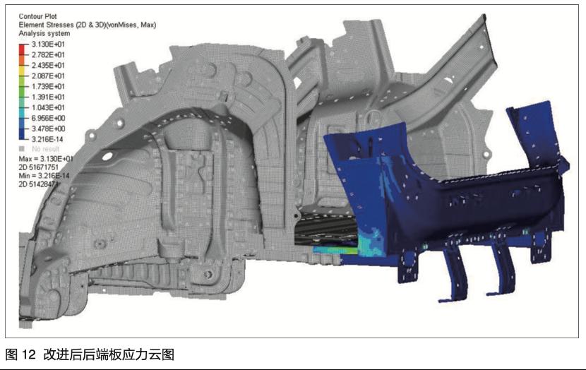 綜上,增加后端板與車身側(cè)面的連接對(duì)于其連接強(qiáng)度具有非常有效的提升作用。由此可知: 后端板無(wú)側(cè)面連接,零部件運(yùn)輸過(guò)程中類似懸臂結(jié)構(gòu),結(jié)構(gòu)連接穩(wěn)定性差,強(qiáng)度較弱;而通過(guò)增 加側(cè)面連接,后端板與下車身連接猶如半包結(jié)構(gòu),連接穩(wěn)定性高,強(qiáng)度較高。
