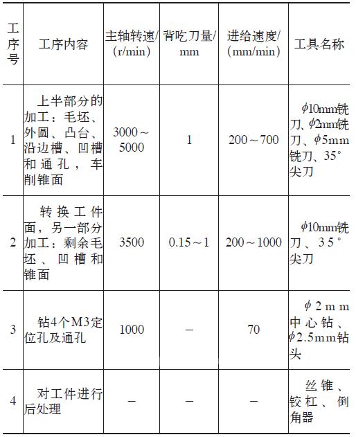 轉(zhuǎn)換工件面,用與殼體相適應(yīng)的夾具進行固定,銑削掉余量毛坯后,可以對φ72mm凹槽輪廓4個孔位進行粗銑和精銑;接著粗車、半精車和精車103°錐面;最后銑削掉剩余部分的毛坯,同時按照圖樣尺寸分別在4個孔位鉆M3孔。之后對工件進行后處理,加工完成。盤式電動機殼體機械加工工序內(nèi)容及工藝參數(shù)見表1。