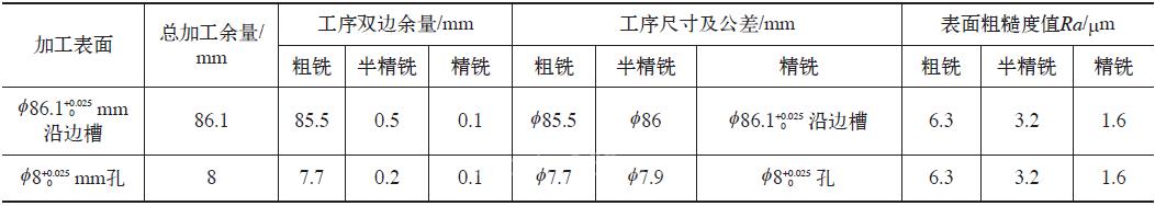 盤式電動機殼體上2個標注公差的尺寸表面都需要在機床上進行多次加工,從而達到其尺寸公差標定的要求和一定的表面粗糙度。按照圖樣所要求的參數(shù),通過正確的加減運算可計算出每道工序的工序尺寸[8]。盤式電動機端蓋標注公差尺寸的表面的總加工余量、工序雙邊余量、工序尺寸及表面粗糙度具體數(shù)值見表2。