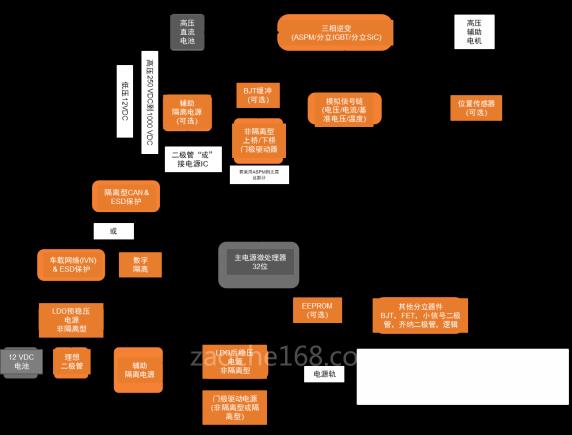 圖2:汽車(chē)高壓輔助系統(tǒng)應(yīng)用框圖 (橙色代表安森美可提供的產(chǎn)品)
