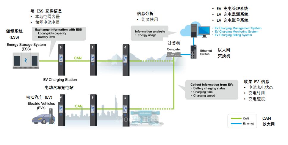 獨(dú)立式電動(dòng)汽車充電站運(yùn)行時(shí)無需連接網(wǎng)絡(luò),聯(lián)網(wǎng)式充電站則需連接到充電網(wǎng)絡(luò)。相較之下,聯(lián)網(wǎng)式充電站更具優(yōu)勢(shì)。連接多個(gè)電動(dòng)汽車充電站,形成充電系統(tǒng),有助于運(yùn)營商通過應(yīng)用平臺(tái)輕松實(shí)現(xiàn)能源使用遠(yuǎn)程管理。電動(dòng)汽車充電系統(tǒng)能夠輕松收集每輛電動(dòng)汽車信息,如充電狀態(tài)和能源使用情況,并根據(jù)充電時(shí)長和充電量向車主提供賬單信息。此外,該類系統(tǒng)能與電網(wǎng)和儲(chǔ)能系統(tǒng) (ESS) 互換信息,提高從 ESS 向電動(dòng)汽車充電站供電的穩(wěn)定性和可靠性。例如,當(dāng)電網(wǎng)突然處于用電高峰時(shí),電動(dòng)汽車充電系統(tǒng)將會(huì)向 ESS 發(fā)送信息,請(qǐng)求使用儲(chǔ)能電池中的電能。