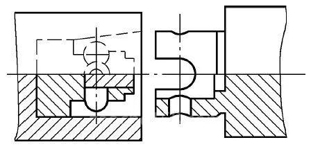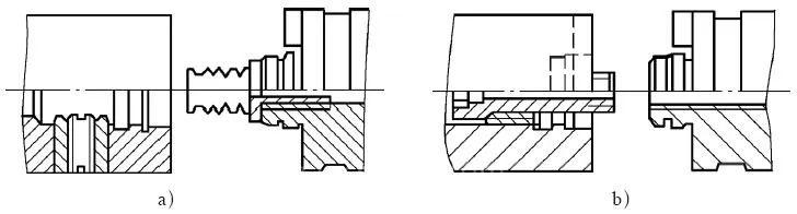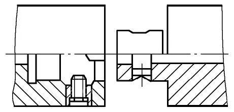 工具系統(tǒng) Novex工具系統(tǒng)是由德國(guó)瓦爾特公司開發(fā)的,其接口形式為圓錐定心,錐孔、錐體與所在模塊同軸,軸線上用螺釘拉緊,錐孔端面與錐孔軸線垂直,錐體根部環(huán)形端面與錐體軸線垂直,并可與錐孔端面貼合,如圖8-30a所示。錐孔錐角略大于錐體錐角,造成結(jié)合時(shí)小端接觸,拉緊后接觸區(qū)會(huì)產(chǎn)生彈性變形。直至端面貼合、壓緊為止。錐體中間的同軸孔有易于變形且不影響螺紋松緊的作用,錐度配合面的角度差可大到20′。端面互相壓緊后首先是外緣相接觸,因此至少有一個(gè)端面是輕微內(nèi)凹的(或在端面大徑區(qū)有一條輕微軸向高出端面的接觸帶)。上述結(jié)構(gòu)采用系軸向拉緊,使用中組裝不太方便。瓦爾特公司于1989年又推出徑向鎖緊的Novex-RADIAL結(jié)構(gòu),如圖8-30b所示。其接口部分包括互相嵌合的錐度部分及軸向延伸的拉釘,接納孔的一端由端面、定心錐孔和夾緊裝置組成。延伸拉釘上有個(gè)角度很大的錐面(與回轉(zhuǎn)軸線同心)。鎖緊元件在雙頭螺釘帶動(dòng)下開合移動(dòng),其上有錐形鎖緊面使其與拉釘上的錐面貼合,內(nèi)、外錐度表面和拉釘?shù)妮S線都要與旋轉(zhuǎn)軸線重合。夾緊元件由雙頭螺栓傳動(dòng),螺栓軸線位于拉釘蘑菇頭的上方。