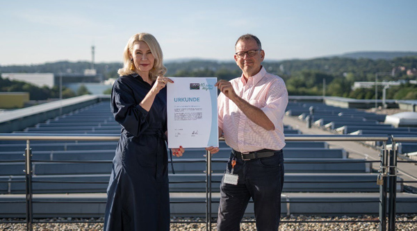 企業(yè)發(fā)展和房地產(chǎn)負(fù)責(zé)人Helene Derksen-Riesen與環(huán)境管理負(fù)責(zé)人Gerhard Linke手持氣候保護(hù)企業(yè)協(xié)會(huì)10年會(huì)員資格的證書。