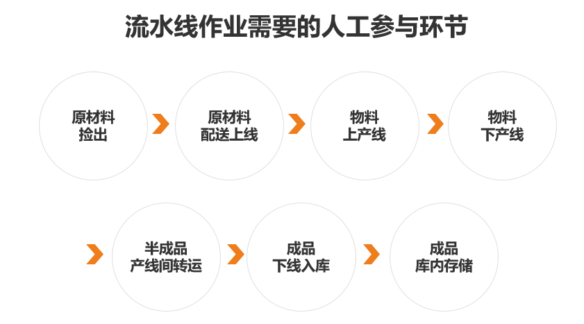 傳統(tǒng)制造產(chǎn)線是利用輥筒或皮帶進(jìn)行物料的傳輸,即俗稱的流水線作業(yè)方式,將一個完整的產(chǎn)品拆分為多道工序,原材料、半成品、成品、包裝后成品等不同產(chǎn)品狀態(tài)在工廠內(nèi)流動,除必要的人工裝配環(huán)節(jié)外,還需要人工參與的環(huán)節(jié)包括:原材料的撿出、原材料的配送上線、物料上產(chǎn)線、物料下產(chǎn)線、半成品產(chǎn)線間轉(zhuǎn)運(yùn)、成品的下線入庫、成品庫內(nèi)存儲等。