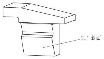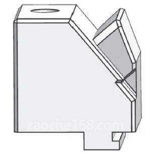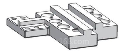 定位活塊結(jié)構(gòu)如圖5所示,材料為45鋼,硬度為35~45HRC,最大外形尺寸為34mm×34.5mm×37mm(長×寬×高),右上角有按異形零件結(jié)構(gòu)和尺寸所設(shè)定位結(jié)構(gòu),大斜面用于跟待加工零件的背面接觸,其與頂面的夾角為130°,小斜面與頂面的夾角為110.5°,使待加工零件的斜面能高出定位活塊而方便進行磨削加工。頂面有1個直徑8mm的銷釘孔,用于銷釘對定位活塊在底座上的定位。底部有1個L形的凸塊,凸塊高5mm、寬10mm,凸塊上有2.5mm×2mm的凹槽,用于壓緊塊導(dǎo)軌及底座的定位和緊固。所有配合面表面粗糙度值Ra為1.6μm。