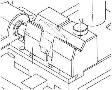 因此,針對現(xiàn)有技術(shù)的不足,本設(shè)計以小型異形零件為研究對象,以加工難度最大的斜面為例,設(shè)計一種結(jié)構(gòu)設(shè)計簡單、操作使用方便、定位夾緊可靠、能夠提高工作效率并減少安全隱患的手推式砂帶打磨進料裝置[1]。如圖2所示,按產(chǎn)品加工位置初定產(chǎn)品定位示意圖,產(chǎn)品輪廓用虛線表示,采用兩個活塊對產(chǎn)品進行定位和夾緊,以滿足加工要求。