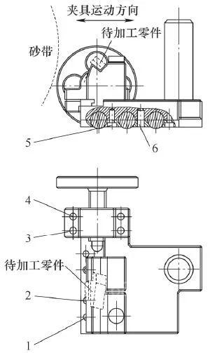 針對異形零件的結(jié)構(gòu)和表面質(zhì)量要求,設(shè)計了一種手推式砂帶打磨進料夾具。工件放置在夾具的動夾持塊和定夾持塊之間,定位夾緊后沿第一直線導(dǎo)向機構(gòu)推動底座,就可完成工件的磨削進給操作。實踐證明,夾具操作簡單,定位夾緊方便可靠,能大幅提高零件加工精度、工作安全性、可靠性及工作效率。