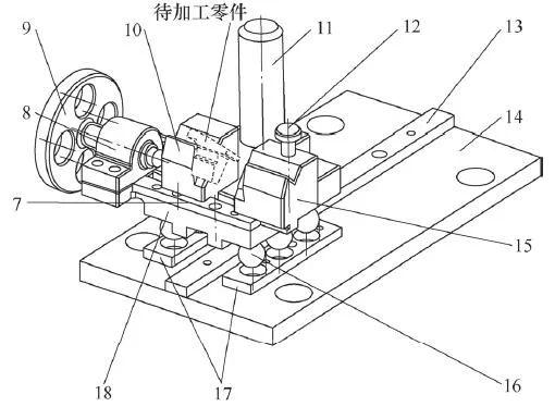 1、3、6—圓柱頭定位銷(2件) 2—盤頭螺釘(2件) 4—盤頭螺栓(2件) 5—內(nèi)六角圓柱頭螺釘(4件) 7—壓緊塊導(dǎo)軌 8—定位螺母 9—壓緊螺栓 10—壓緊活塊 11—手柄 12—定位銷 13—總導(dǎo)軌 14—平臺 15—定位活塊 16—鋼球(6件) 17—底板(2件) 18—底座