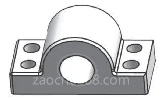 定位螺母結(jié)構(gòu)如圖7所示,材料為45鋼,硬度為35~45HRC,最大外形尺寸為56mm×26mm×27mm(長×寬×高),為方便定位螺母與底座的定位和緊固,定位螺母采用半圓形加掛耳結(jié)構(gòu),定位螺母中間設(shè)有M14螺紋孔,用于同壓緊螺栓配合,實現(xiàn)對加工零件的夾緊與松開,掛耳厚度10mm,兩端對角設(shè)置兩個直徑6mm銷釘定位孔和6.5mm螺栓通過孔。所有配合面表面粗糙度值Ra為1.6μm。