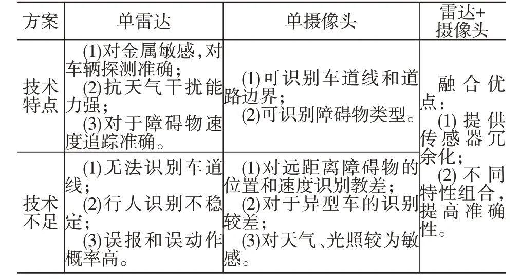 前向智能攝像頭和前向毫米波雷達(dá)融合,實(shí)現(xiàn)ACC、AEB-C/P自動(dòng)緊急制動(dòng)-車/人)、LDW、LKA、TSR、TJA(交通擁堵輔助)、ICA(智能巡航輔助),能實(shí)現(xiàn)L2級(jí)駕駛輔助(圖1)。距離和道路信息均是融合后的數(shù)據(jù),探測(cè)精準(zhǔn)。單雷達(dá)、單攝像頭以及融合方案的對(duì)比見表4。