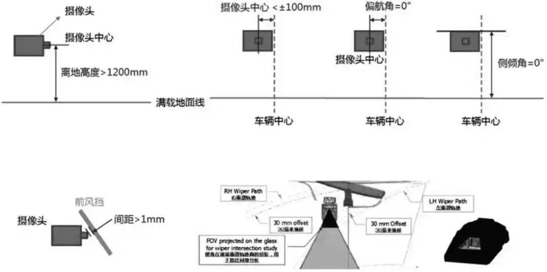 前攝像頭最好的垂直安裝位置是在擋風(fēng)玻璃的中心,高度在1 200 mm以上為佳,可以允許偏移擋風(fēng)玻璃中心線在10 cm以內(nèi)。偏航角、側(cè)傾角、俯仰角最好為0°附近(±3°)。支架應(yīng)該安裝在干凈的玻璃區(qū)域,視角區(qū)域不能被絹印或者印刷遮擋。攝像頭視窗與雨刮軌跡線間距大于30 mm,鏡頭模塊與擋風(fēng)玻璃的之間間隙應(yīng)該保證最小1 mm。開口應(yīng)該由投影在擋風(fēng)玻璃各層的視角決定,攝像頭支架和罩蓋上應(yīng)設(shè)計(jì)通風(fēng)孔(開孔面積大于120 mm2),保證空氣流通。支架安裝在擋風(fēng)玻璃的位置公差通常是±1 mm(定位)和±2.5°(旋轉(zhuǎn))(圖7)。