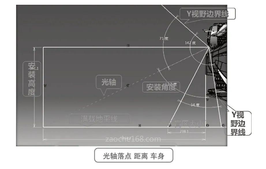 前后攝像頭布置要求:車輛滿載時(shí),離地高度≥600 mm;偏離中心平面距離≤50 mm,建議置于中心平面;視軸與車輛XZ平面平行;視軸與車輛Z軸夾角建議45°到75°,光軸與地面線交點(diǎn)距車身最外側(cè)1 000~2 000 mm;盲區(qū)視野≤200 mm;攝像頭垂直視野在3 000 mm處可完整看到直立于地面3 000 mm高的物體。如圖9為環(huán)視攝像頭(前)布置要求。