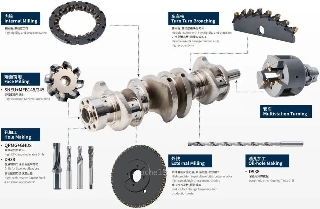 曲軸加工解決方案:針對主軸頸、連桿頸、曲軸大小頭、油孔等部位,適配滿足客戶工況的車銑鉆刀具進(jìn)行加工,如下圖所示。
