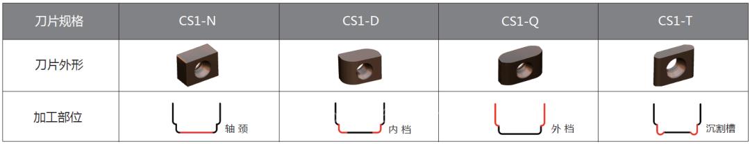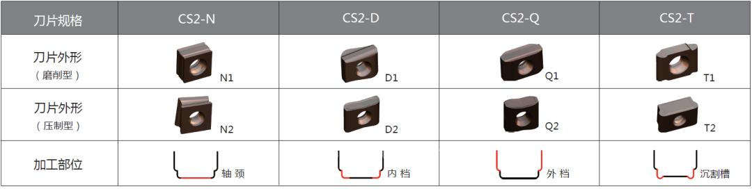 目前已推出CS1及CS2系列刀片,其中CS1系列刀片刀尖強(qiáng)度高,適用于大余量柴油機(jī)曲軸加工,CS2系列刀片刃口鋒利,適用于汽油機(jī)及小型柴油機(jī)曲軸加工。