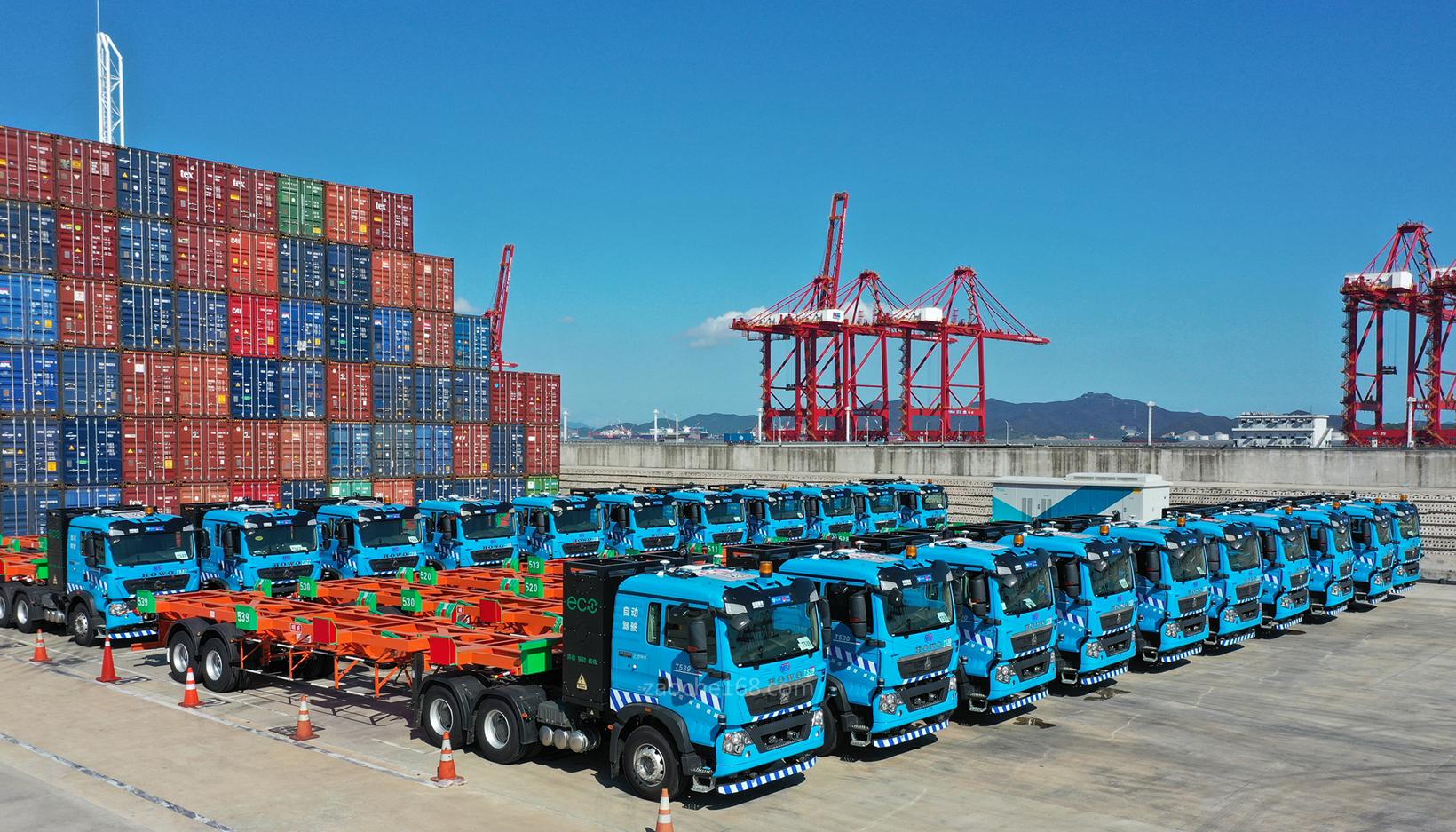配圖:寧波舟山港集團(tuán)梅東公司部分無人駕駛集卡列隊(duì)等待作業(yè)