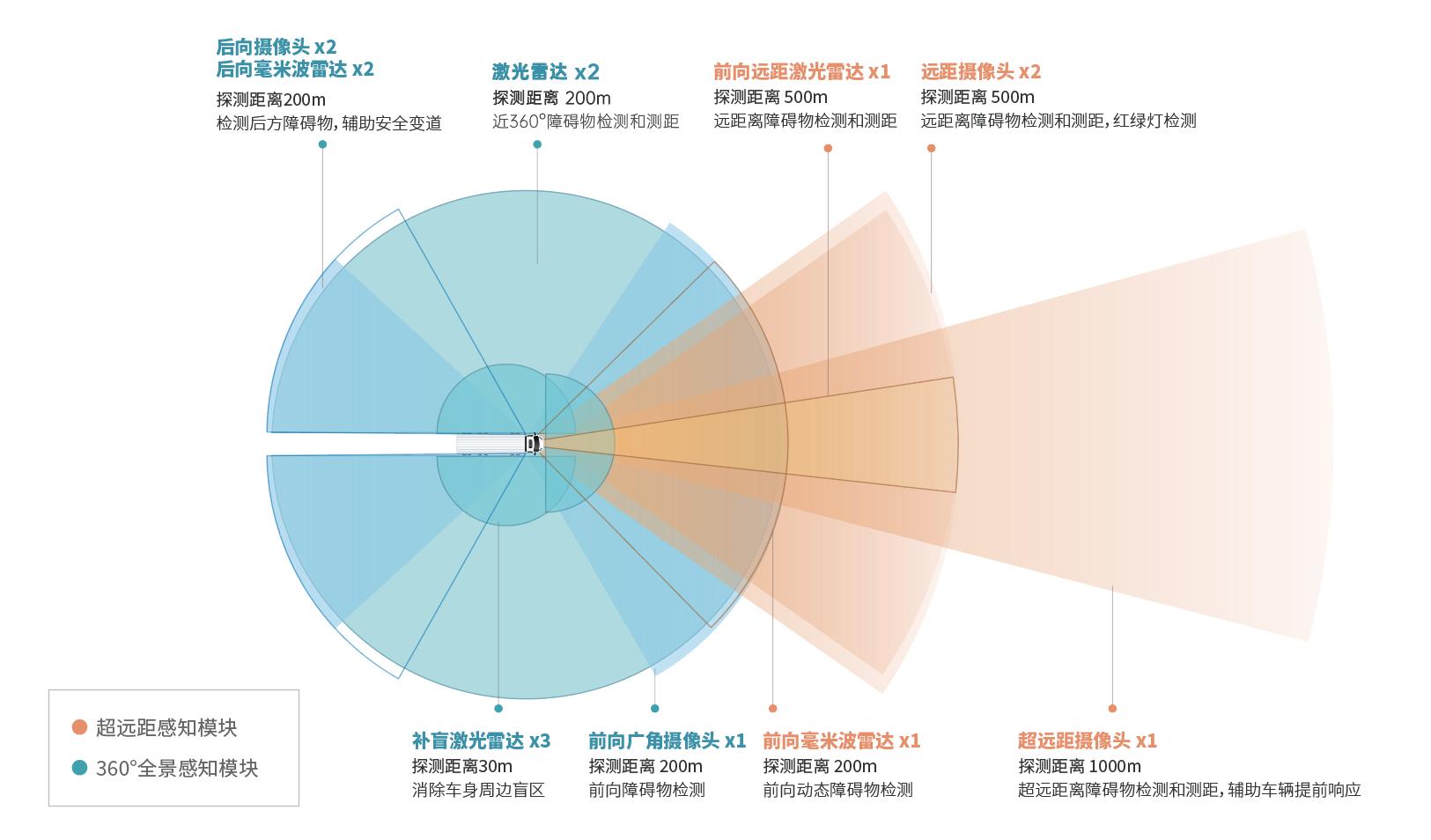 在高速行駛和高載重的業(yè)務要求下,該傳感器方案通過1個超長距攝像頭、2個長距攝像頭、1個量產車規(guī)級長距激光雷達、1個遠距毫米波雷達構成強大的超遠距感知模組,可覆蓋前向200米至1000米障礙物探測。以卡車90公里/小時的行駛速度計算,超遠距感知模組可讓自動駕駛卡車提前30秒精準識別出前方故障車輛,做到從容避障。