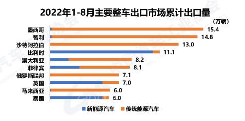1~8月,中國汽車出口量前十的國家中,墨西哥、泰國市場表現(xiàn)較強,同比分別增長2.2倍和1.8倍。新能源汽車出口的前三大市場為比利時、英國和泰國。