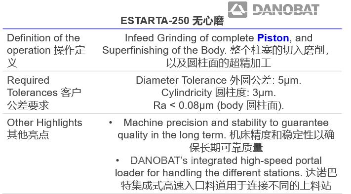 不急,我們先來看看用于液壓元件的ESTARTA-250無心磨。它不僅可以針對整個柱塞進(jìn)行切入磨削,還可以對圓柱面進(jìn)行超精加工。它可以滿足外圓公差5μm、圓柱度3μm、表面粗糙度Ra小于0.08μm的公差要求,機(jī)床的精度與穩(wěn)定性可以確保生產(chǎn)的長期可靠性。另外,達(dá)諾巴特集成式高速入口料道可以用于連接不同的上料站,可謂是企業(yè)快速換型、高效加工的智能法寶。