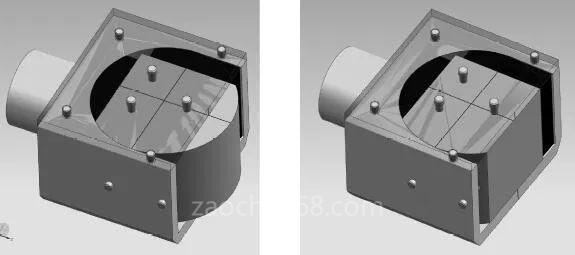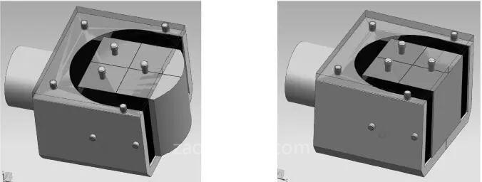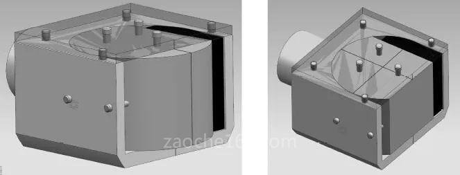 正六面體結(jié)構(gòu)在使用車(chē)床加工時(shí)裝夾困難,加工過(guò)程中找正和定位困難,使用通用夾具無(wú)法加工出理想效果。在對(duì)正六面體件進(jìn)行鏤空處理時(shí),因?yàn)榱慵诤褡儽?,在加工時(shí)零件產(chǎn)生變形、斷裂,所以各個(gè)孔位的尺寸及深度需要嚴(yán)格控制,采用專(zhuān)用夾具進(jìn)行裝夾和輔助支承進(jìn)行緊固,使鏤空后的各個(gè)表面定位準(zhǔn)確,裝夾方便,易于加工,達(dá)到理想效果。
