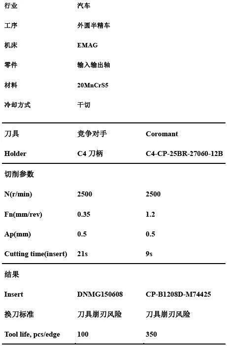汽車行業(yè)的加工,分秒必爭(zhēng),通過(guò)采用山特維克可樂(lè)滿全新的CoroTurn PrimeB刀具,給客戶帶來(lái)了極大的競(jìng)爭(zhēng)優(yōu)勢(shì),刀具壽命較常規(guī)通用系列提升250%,單刀片切削時(shí)間節(jié)省12s,同時(shí)避免了操作工中途加工換刀的麻煩,可以實(shí)現(xiàn)一班一換,山特維克可樂(lè)滿新方案的應(yīng)用成果在客戶處獲得了極高的評(píng)價(jià)。