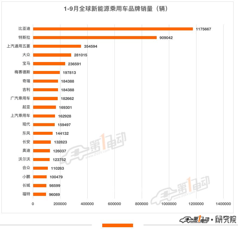 2022 年九月全球新能源車銷量突破100萬輛,比亞迪銷量超20萬輛位居第一,其次是特斯拉,銷量達到19萬輛。前九月全球新能源乘用車銷量6,815,282輛,其中比亞迪銷量突破了117萬輛,特斯拉銷量90.9萬輛。