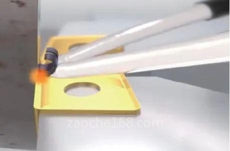 高壓射流不僅要求液壓泵的壓力比普通壓力機(jī)床的冷卻泵壓力要高很多,而且整個(gè)機(jī)床的切削液管路需要高壓管路,罩殼亦要能防止高壓的水流外滲。高壓射流沖擊斷屑如圖3所示。