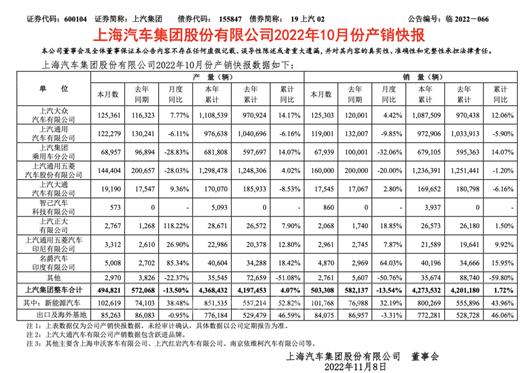 具體看來,上汽集團(tuán)10月共生產(chǎn)整車49.48萬輛,銷售整車50.33萬輛,產(chǎn)銷同比下滑13.50%和13.54%;今年1月-10月,上汽集團(tuán)累計(jì)生產(chǎn)整車436.84萬輛,銷售整車427.35萬輛,分別同比增長4.07%和1.72%。