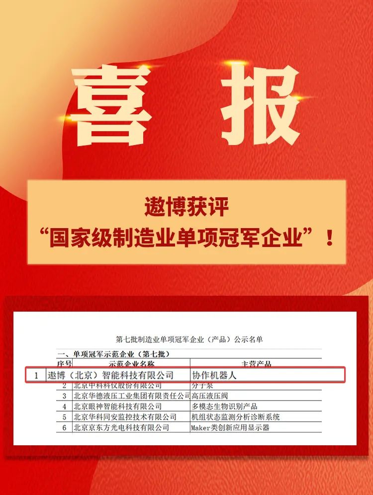 近日,工業(yè)和信息化部、中國工業(yè)經(jīng)濟(jì)聯(lián)合會發(fā)布了“第七批國家級制造業(yè)單項冠軍企業(yè)(產(chǎn)品)名單”,遨博(北京)智能科技股份有限公司獲評“制造業(yè)單項冠軍示范企業(yè)”,成為最新一批名單中協(xié)作機(jī)器人領(lǐng)域唯一獲此殊榮的企業(yè)。