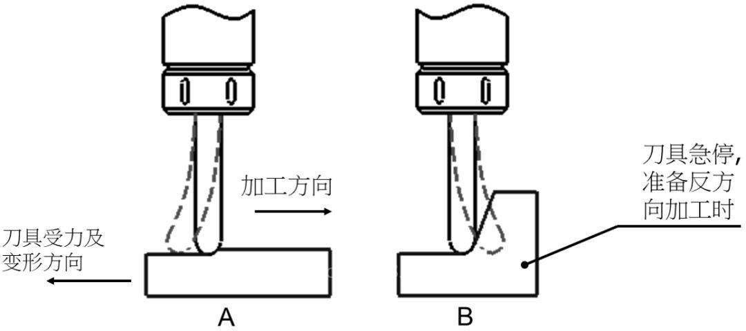 如下圖所示,A圖是刀具在加工較平坦位置時(shí)的狀態(tài),當(dāng)加工到B位急停,準(zhǔn)備反向加工時(shí),由于慣性作用,刀具會(huì)產(chǎn)生變形,從而造成在B位較直身位處彈刀過切。
